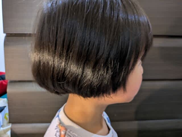 あ、前髪も揃えました。見た目パッツンになるべくならないよう、若干シャギーにしながら…。朝、ママは気付いたかしらね?
