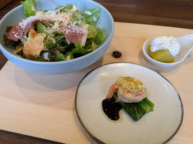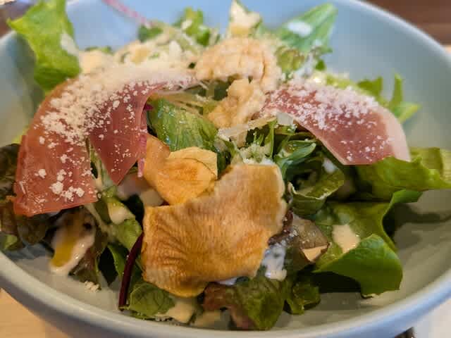 前菜のサラダ🥗からして美味しいのよ。この芋🥔とかもびっくりするくらい美味しかった😋。あとはサラダにハモンセラーノ乗って🐷て、これも美味しく。