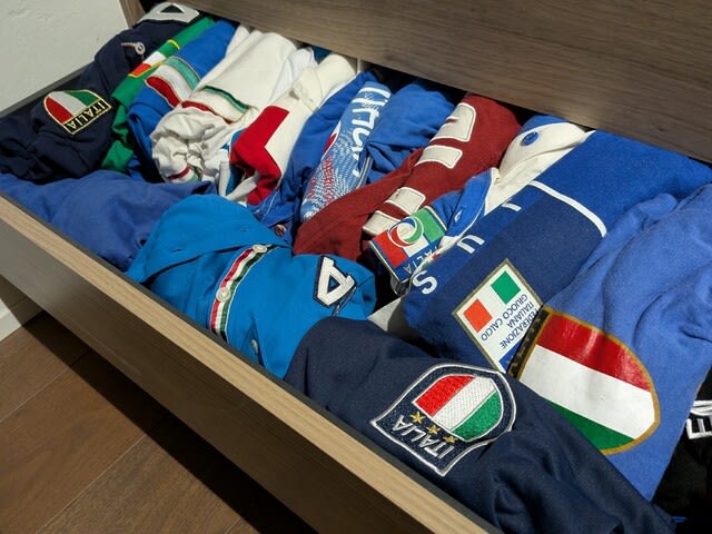 因みにこの棚はイタリア国旗🇮🇹が付いている服のみ🎽👚👕🩳入ってて。入り切らんので他の棚にもイタリア国旗🇮🇹が付いてるものたくさんあります、まだまだ😆🤌。