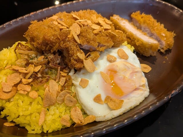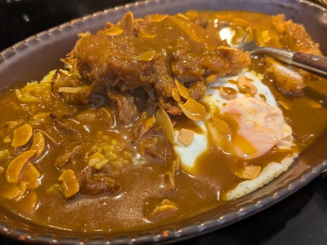 三宿の喜楽亭でカツカレー🍛を食べたくて。もう31年も食べとるね😋。いつぞやから、中辛、カツカレー、目玉焼き🍳にガーリックチップ🧄トッピングと、固定化させていてメニューすら見ない。
