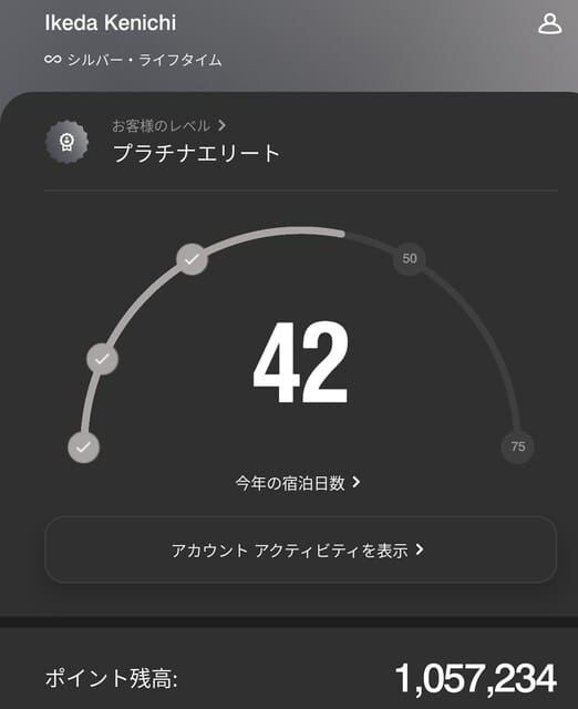 流石にそろそろ使うかなw。貯まる一方で全然使っていないんで。ポイントで泊まると、宿泊数にカウントされないんでねぇ(カウントされる時もあるがよく分からん、、、)。累積の宿泊数の、ライフタイムのステータスは別途あって、今日現在で今までマリオット系列では311泊。400泊になるとゴールドステータスになるそうな。ま、これはまだ数年掛かるでしょうね。。。昔は出張で年間250泊前後もしていて、ホテルに泊まるのが嫌で嫌で仕方なかったんですけどねぇ。。。