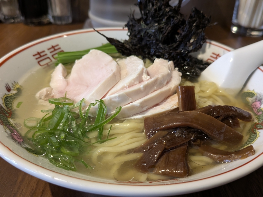 前に奥さんが食べてて1口貰って美味しかった塩鶏麺を。うん、大盛りにして正解。めっちゃ美味しかった。並んで入る価値のあるお店だね。