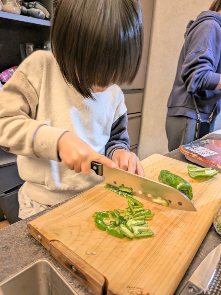 ちゃんとピーマン🫑の切り方🔪を示した上で切ってもらいましたが、一緒に料理する楽しみを感じてくれたら良いな。